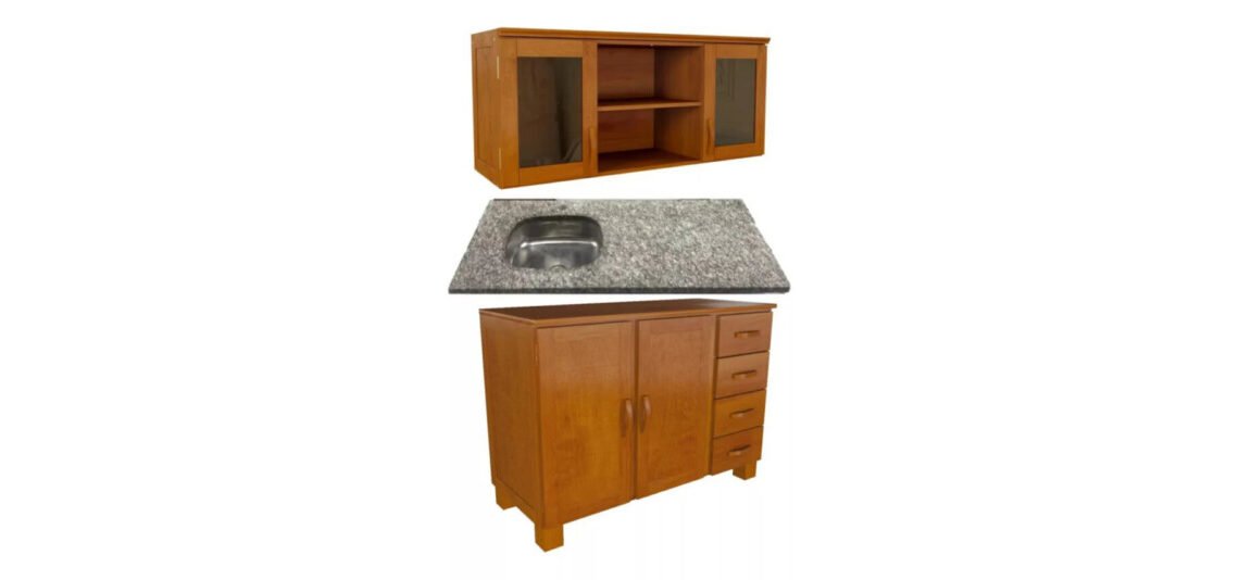Bajo Mesada en Madera + Aéreo 2 Puertas + Granito Gris Bacha izquierda
