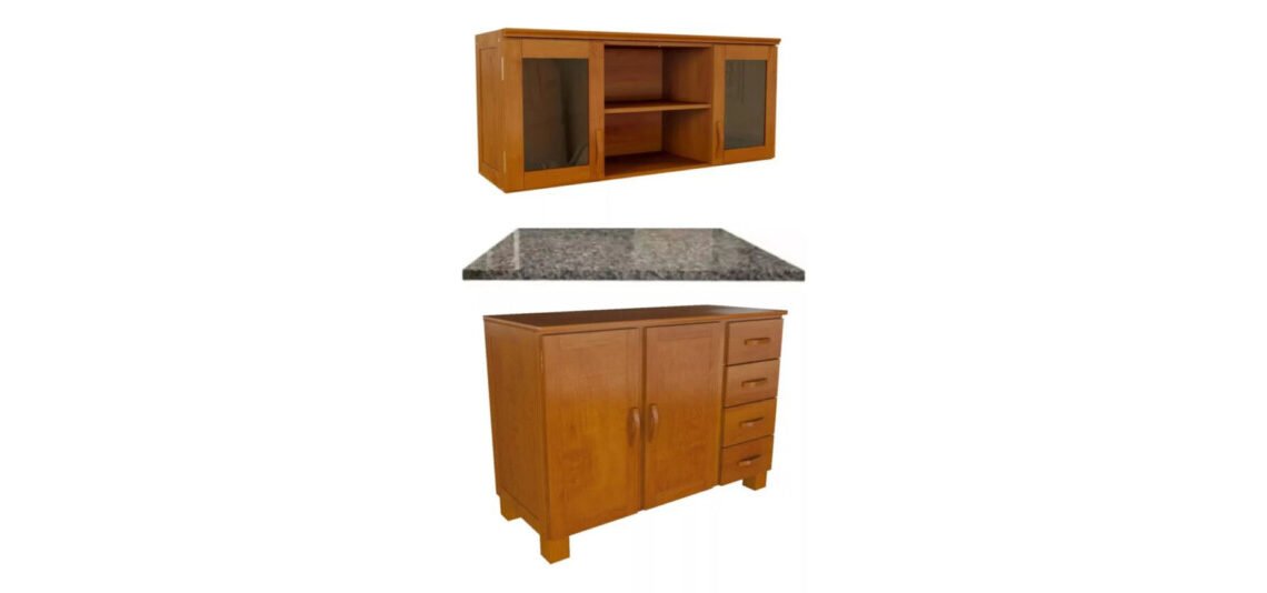 Bajo Mesada en Madera + Aéreo 2 Puertas + Tapa de Granito Gris